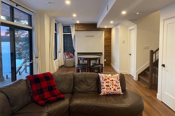View of cottage from dock showing beach and watercraft; hottub on 1st balcony of cottage.