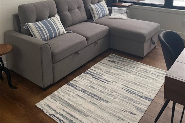 Sleeper sofa storage showing where to find bedding and linens when needed.