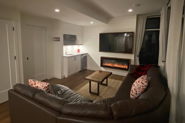 Downstairs entertainment area features a fireplace as well as large-screen TV