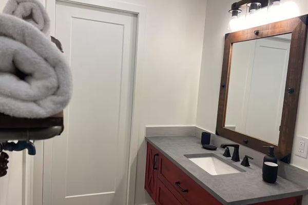 The luxurious bathtub provides comfort and a view of beautiful Lac McGregor