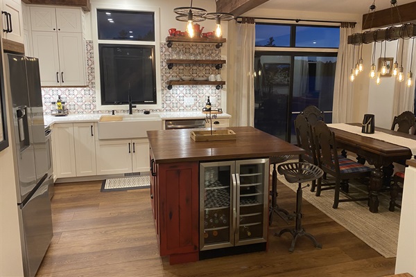 Well-equipped kitchen with island, custom cabinetry and cottage main entrance door nearby